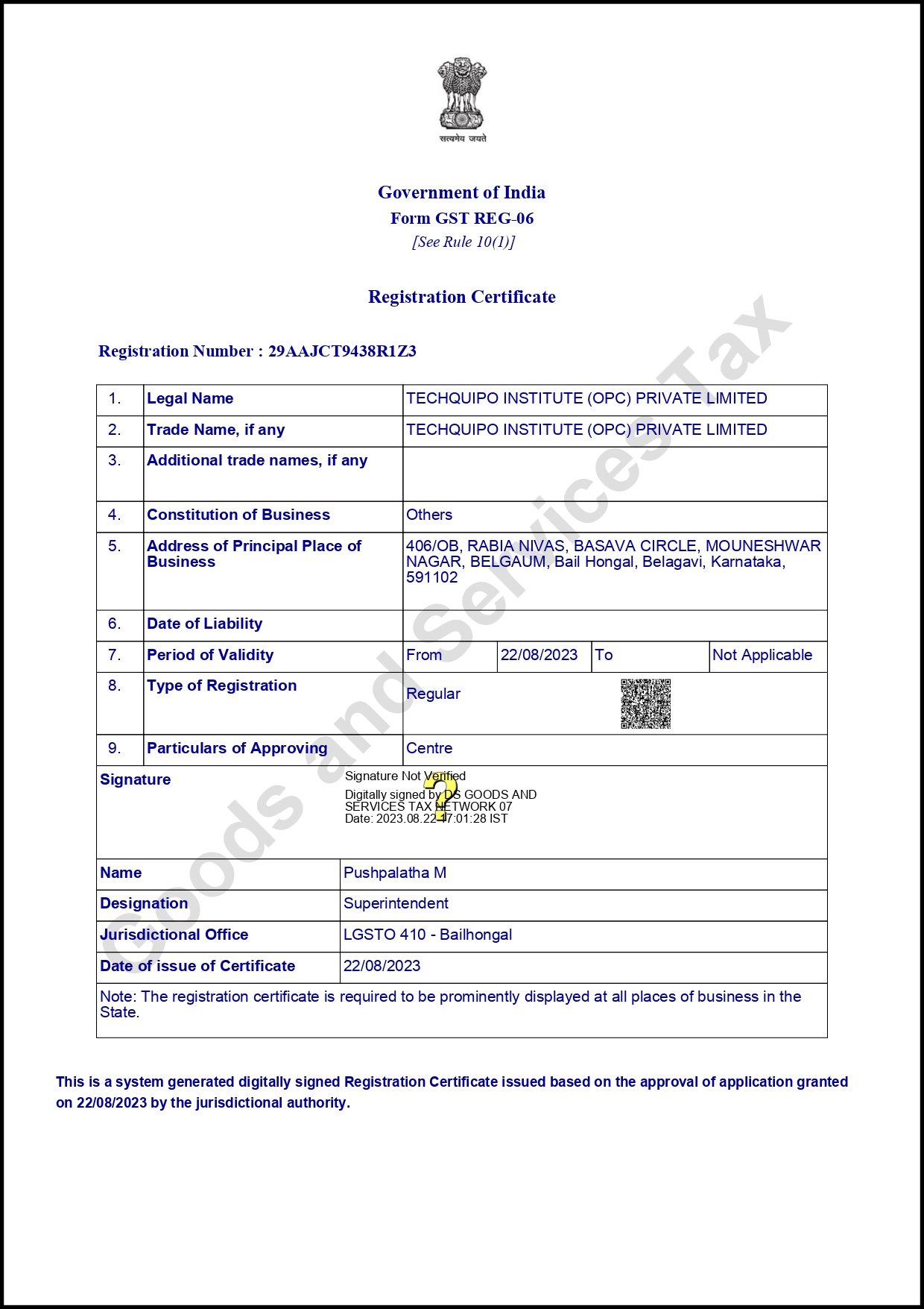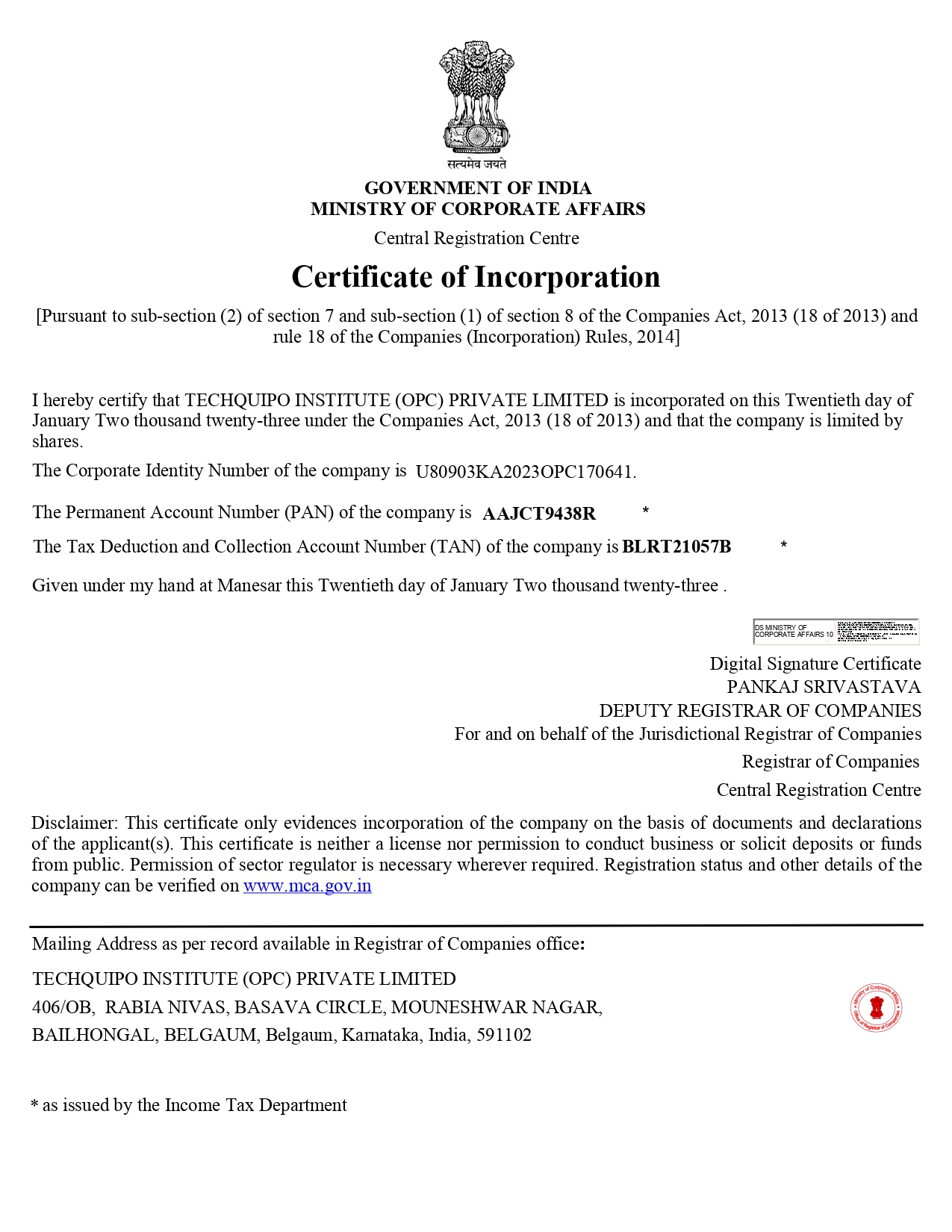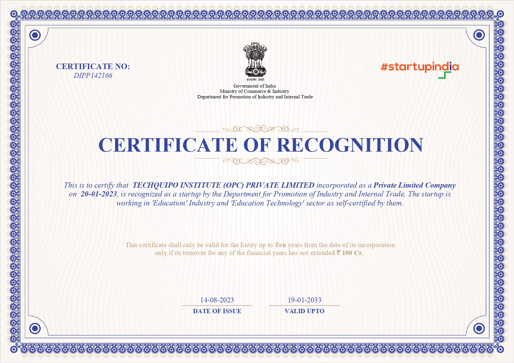 ATC Certificate for Institute